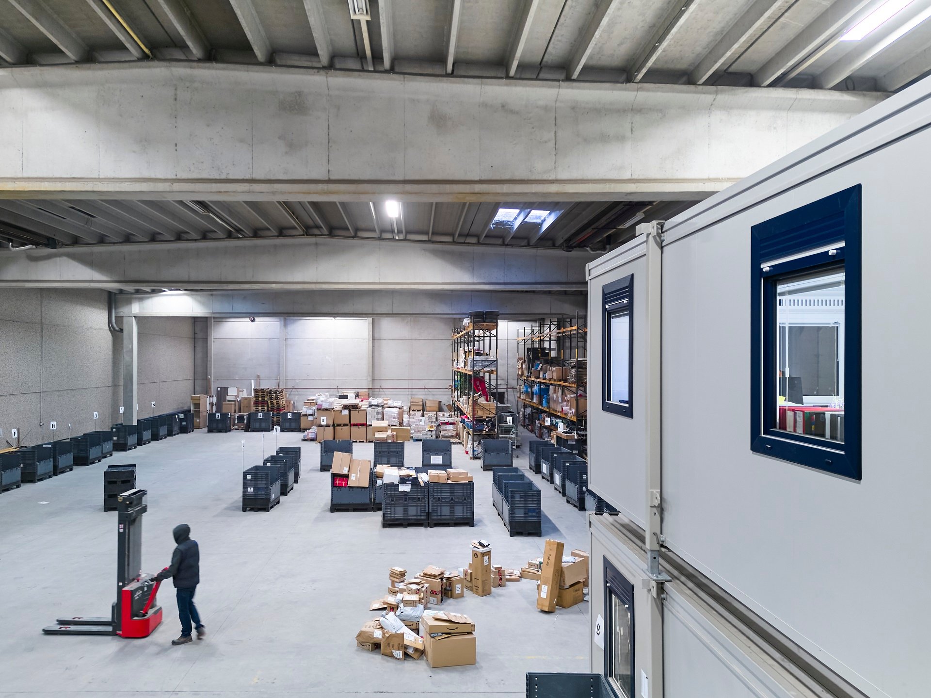 Un réfectoire et des bureaux avec sanitaires à l'intérieur d'un entrepôt