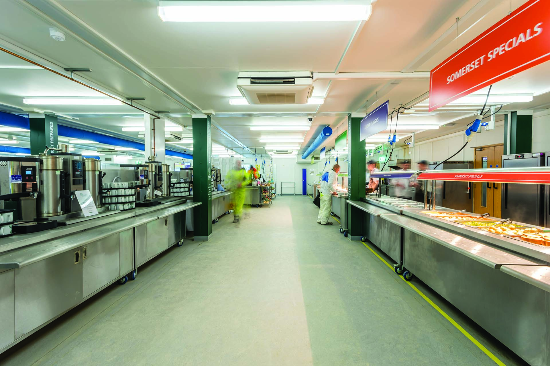Les experts de Portakabin sont en mesure de fournir des réfectoires et installations de restauration entièrement équipées. L'équipe peut créer des environnements de restauration collective lumineux, hygiéniques et dernier cri pour répondre à vos besoins. Que vous souhaitiez un simple espace de pause ou un vaste réfectoire, les grands espaces sans poteau qu'offrent les constructions Portakabin vous garantissent la plus grande flexibilité pour créer des lieux de restauration de toute taille.