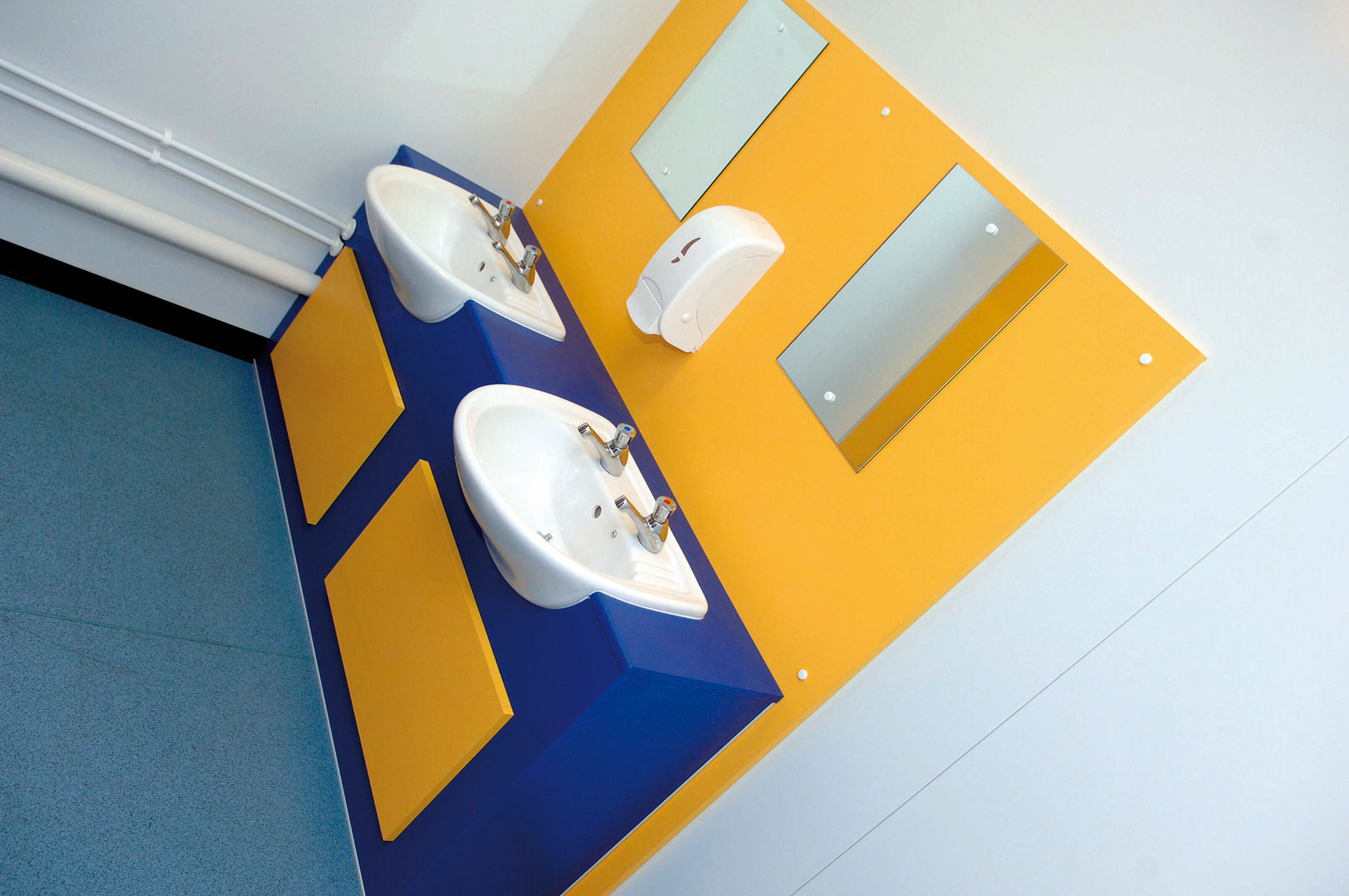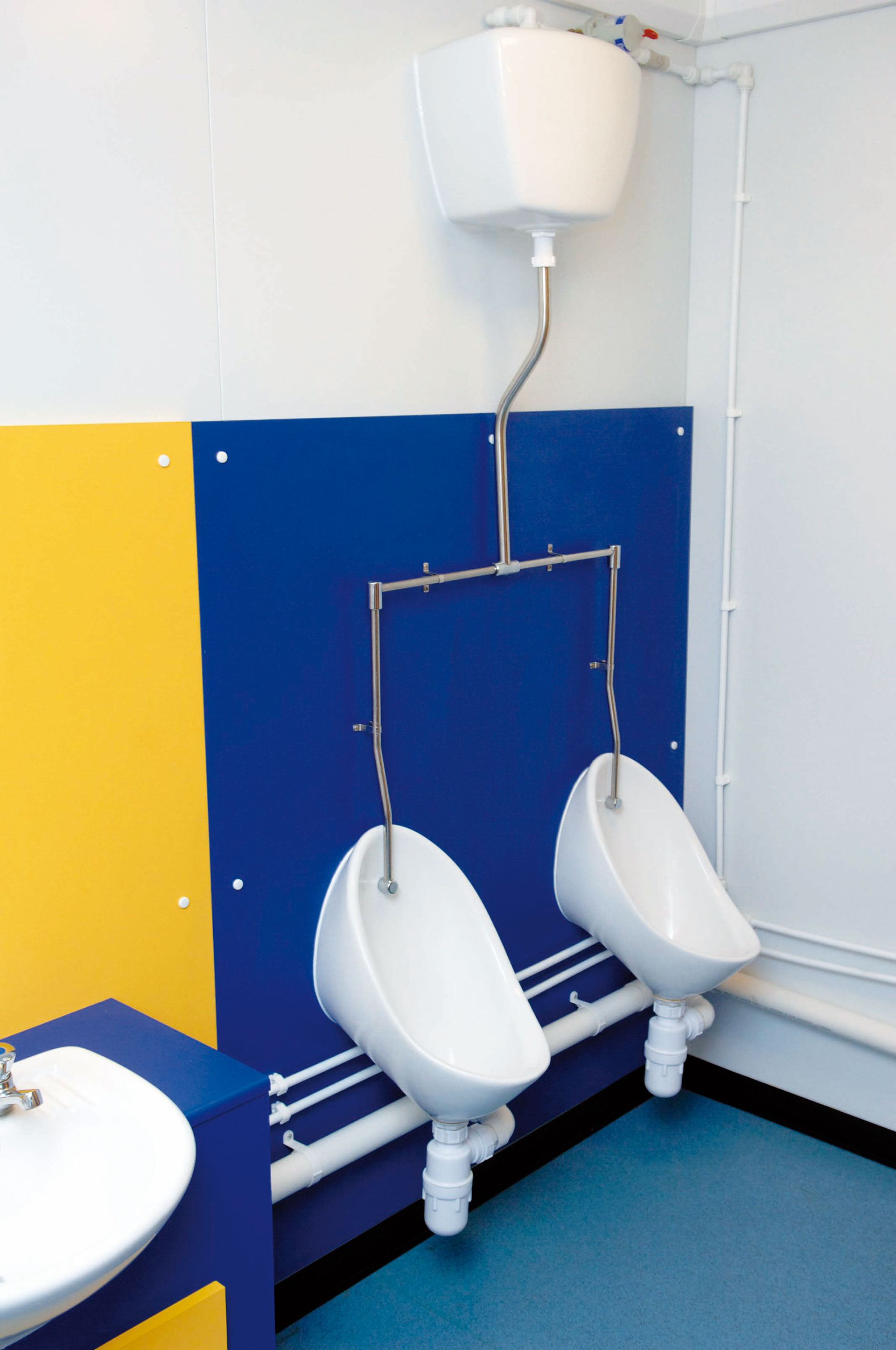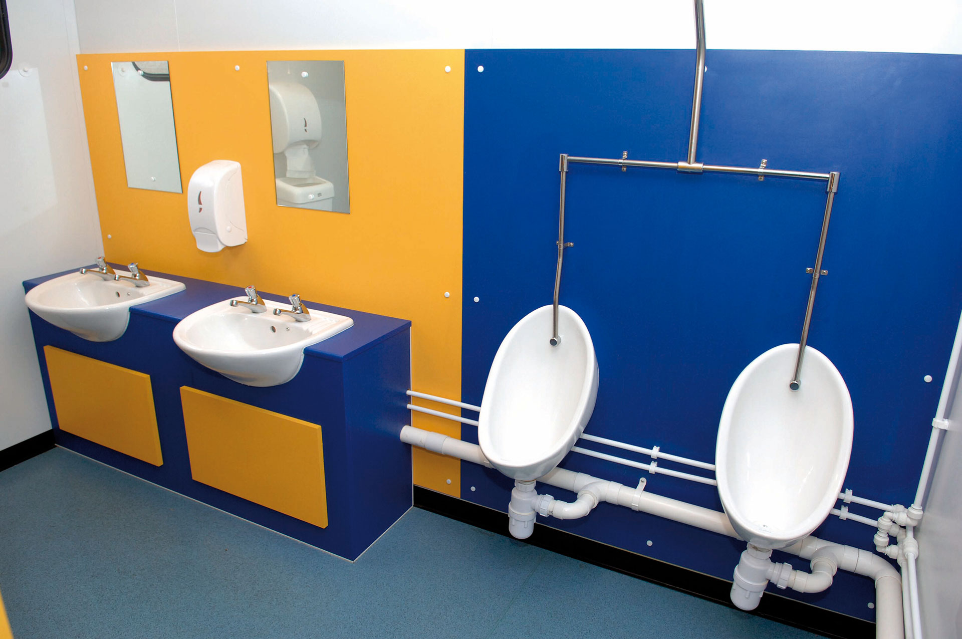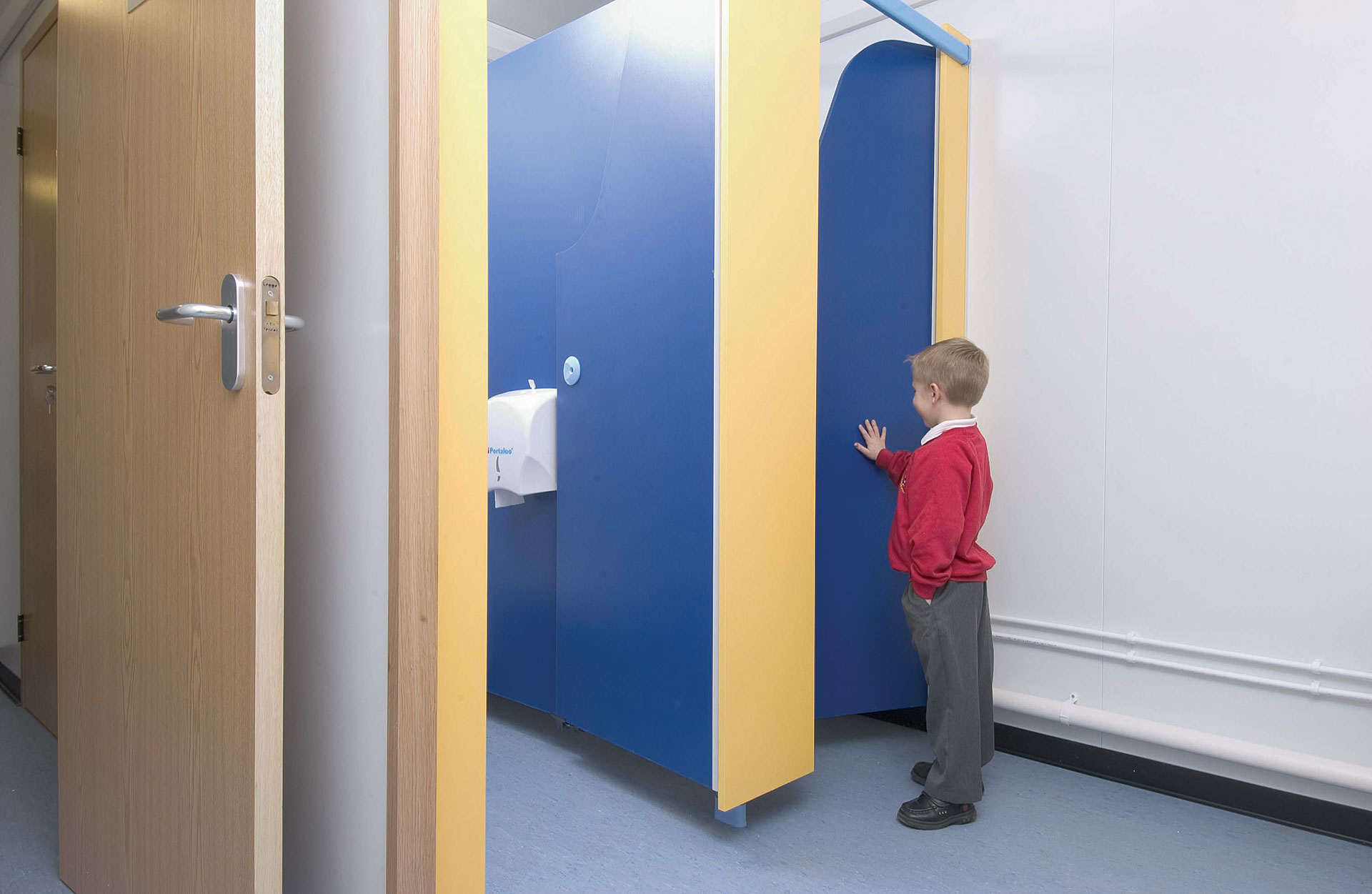 Toilettes Junior Portakabin : conçues pour encourager l'autonomie tout en permettant la surveillance d'un adulte si nécessaire. Chaque bâtiment offre quatre toilettes, quatre lavabos et deux urinoirs, avec des espaces séparés pour les filles et les garçons, soit des équipements suffisants pour pourvoir aux besoins, jusqu'à 80 élèves.