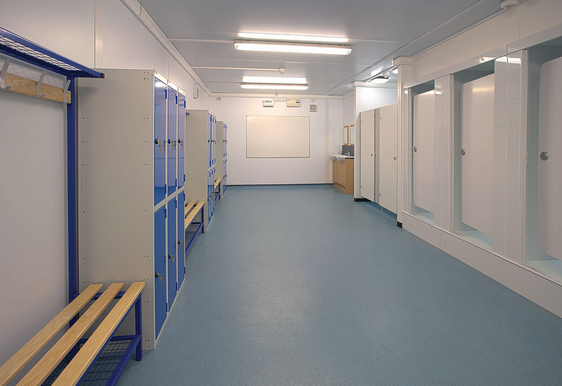 Portakabin portable changing rooms feature the same high-quality showers and compartments as our shower units, but also have a toilet, more extensive bench seating and a large communal changing area. For the classic football changing rooms and other team sports you can choose specially designed changing rooms with large communal shower and changing areas, additional toilet cubicles and space for kit storage, and an office or disabled persons' facilities.