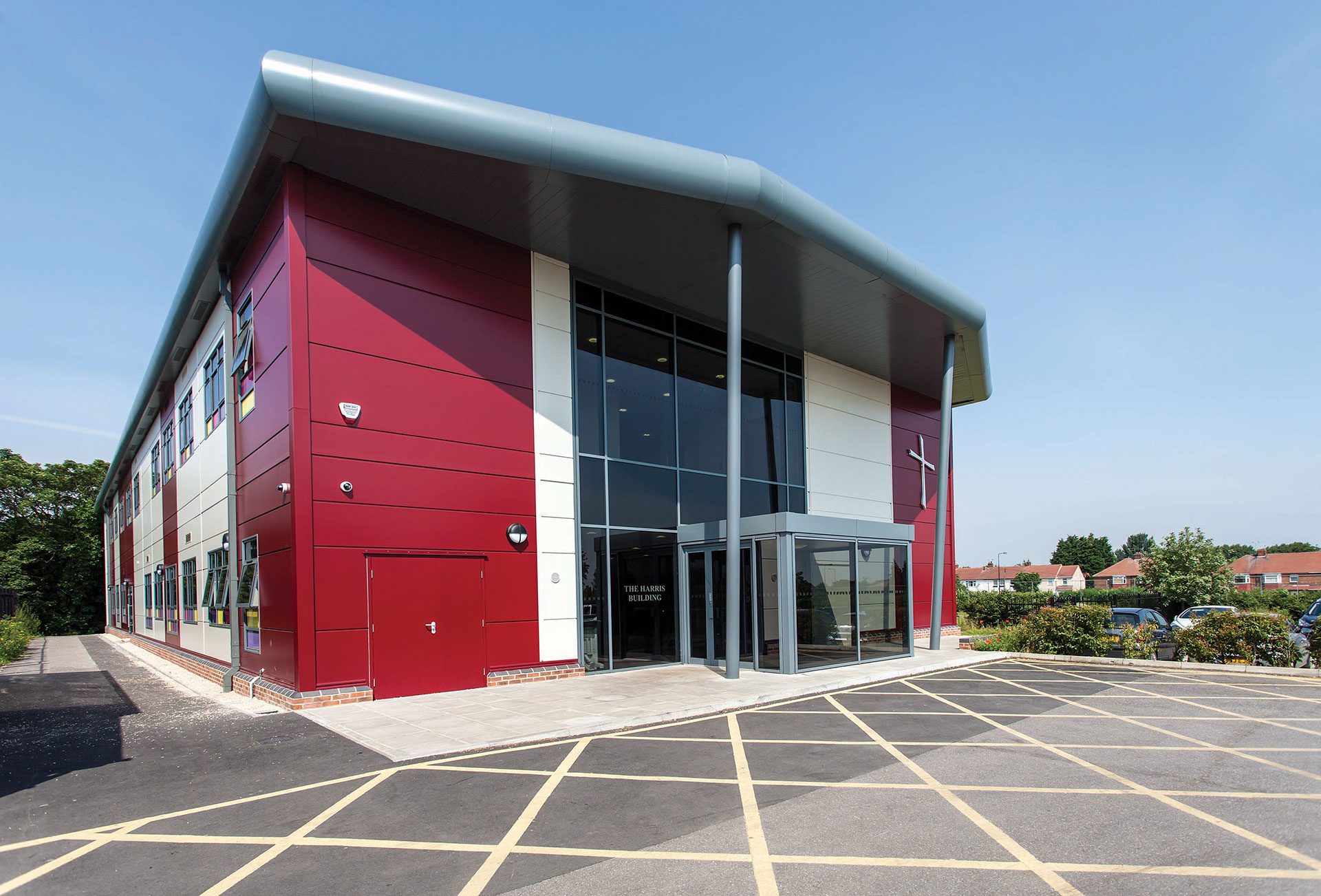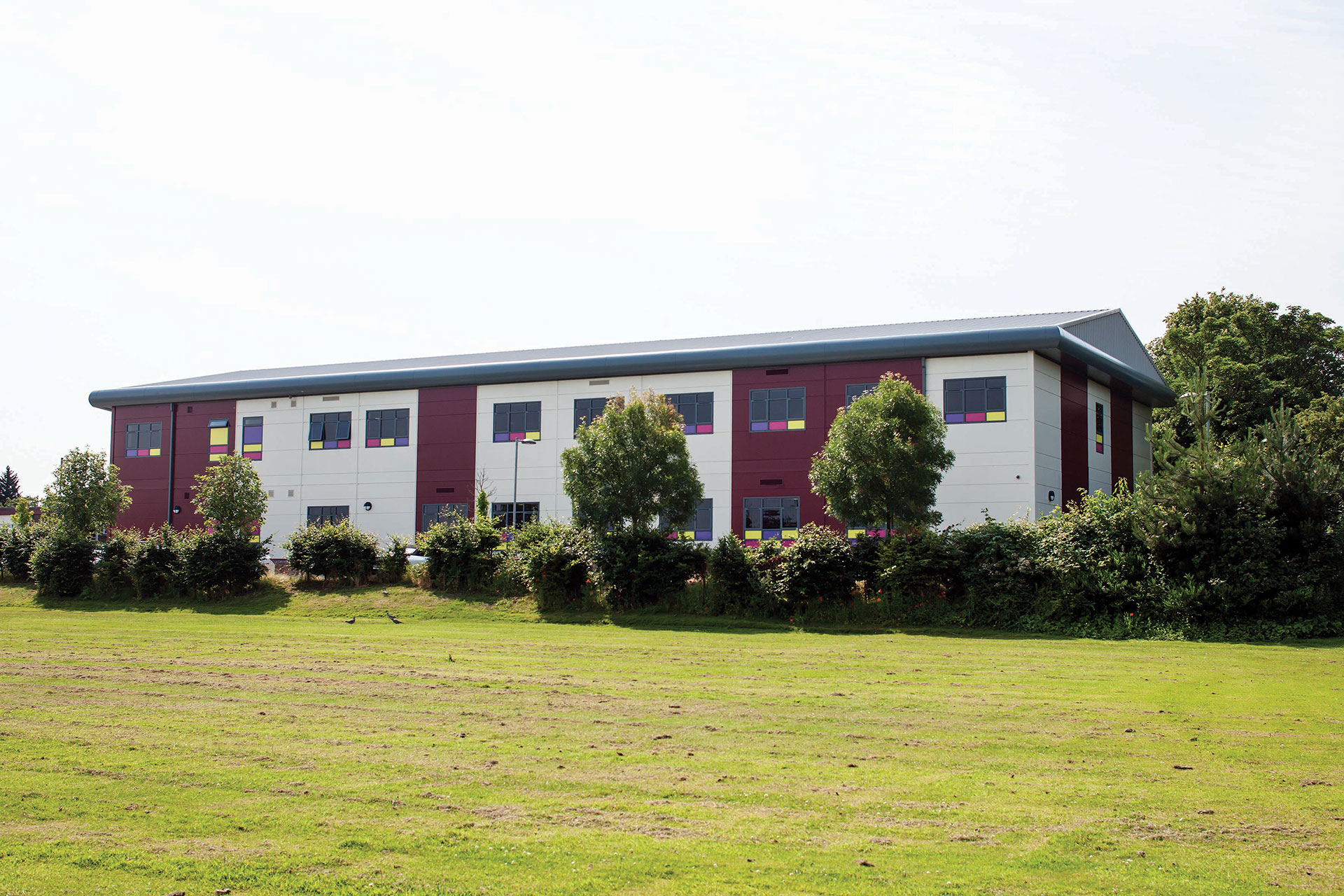The building was designed to create a bold statement and to reflect the contemporary appearance of existing school buildings. Architectural features included an overhanging pitched roof for the entrance canopy, full-height glazing to the front elevation and an external façade in the school’s distinctive corporate colours. Multi-coloured infills to the lower sections of the windows added further interest and created a strong identity.