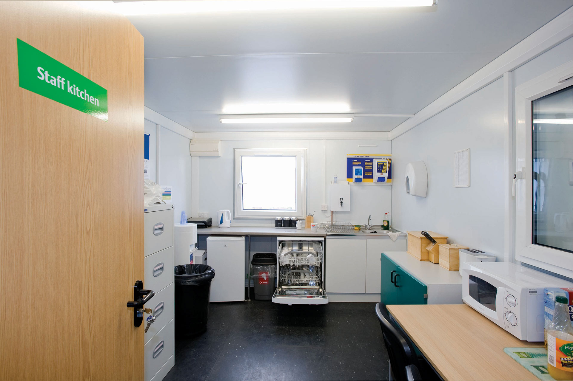 Konstructa Energy-Saver buildings were developed in response to increased demand for environmentally friendly site accommodation from across the industry. They incorporate a range of energy-saving features that enable water usage to be cut by 70% and electricity use by 40%. Lights are fitted with motion detectors so they are never left on when the building is empty, all heaters have timer controls and toilets are fitted with low-volume dual-flush systems. The buildings are insulated all round with CFC-free ozone-friendly foam and all windows are double-glazed to minimise heat loss.
