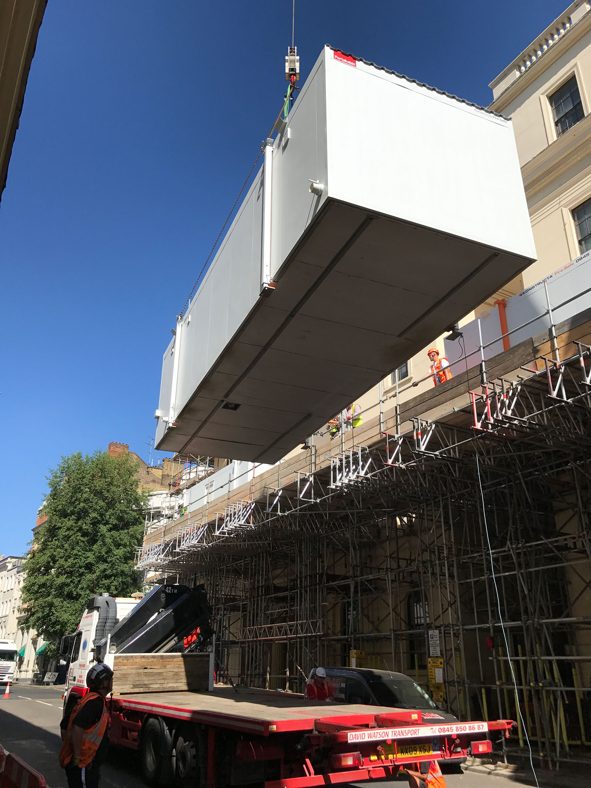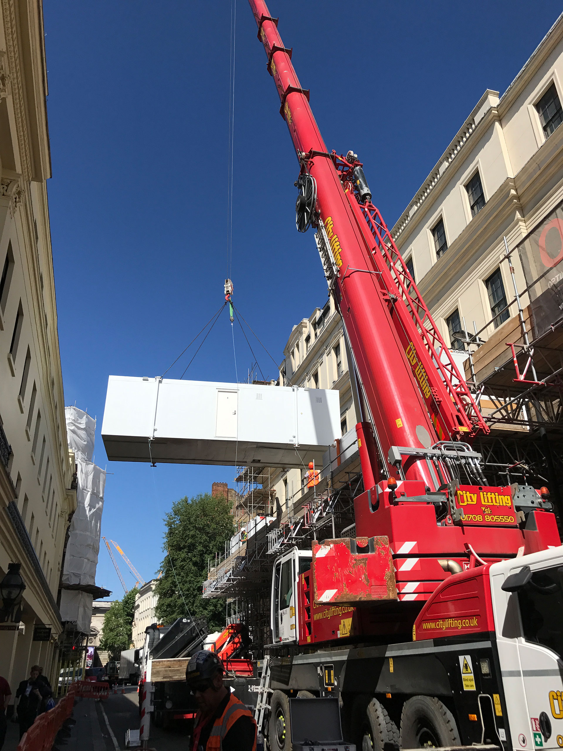 Nathan Sydney from Portakabin (Site Accommodation) says: "This was an exceptional installation for us. We coordinated our delivery with the installation team onsite to lift six cabins into position onto the gantry, end-to-end, across the face of the building. We only had a two hour window in which to receive delivery of the cabins and then lift into position. Not only was it a residential street with a high level of traffic congestion but also a main thoroughfare through central London, right next to Covent Garden, so it was vital we worked closely with Overbury to coordinate a precise operation."