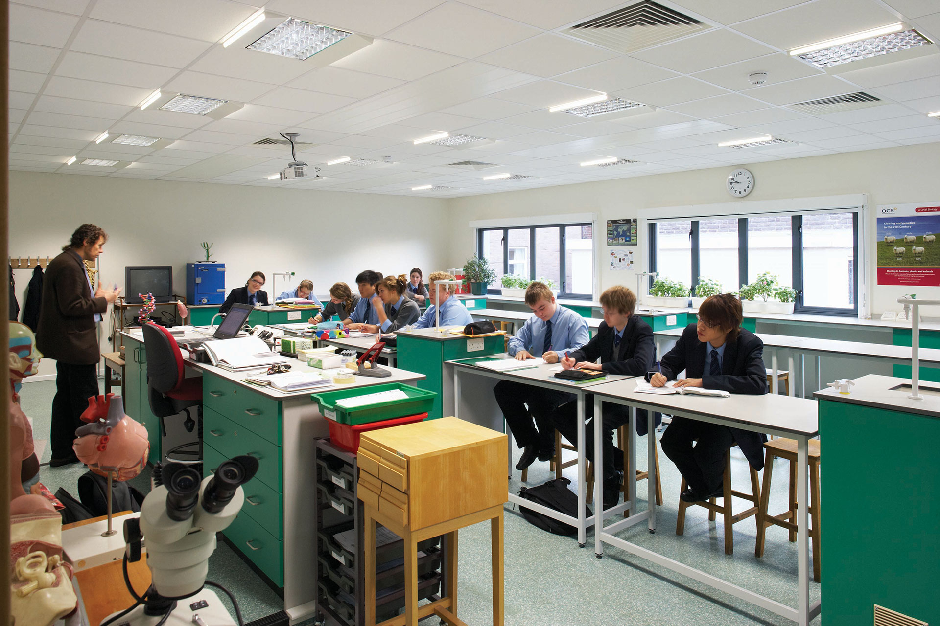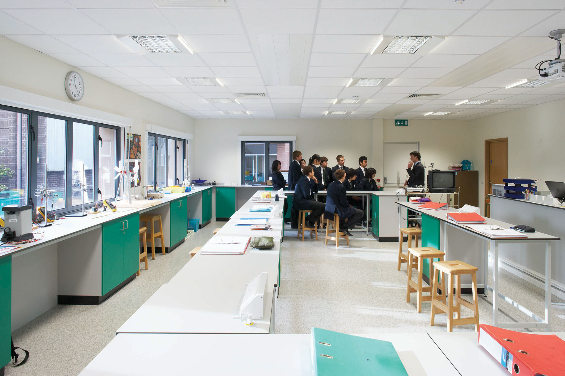 The new building incorporates two physics laboratories, two biology laboratories, a sixth form project room, technicians’ rooms and a double-height central atrium that functions as a teaching area and exhibition space.