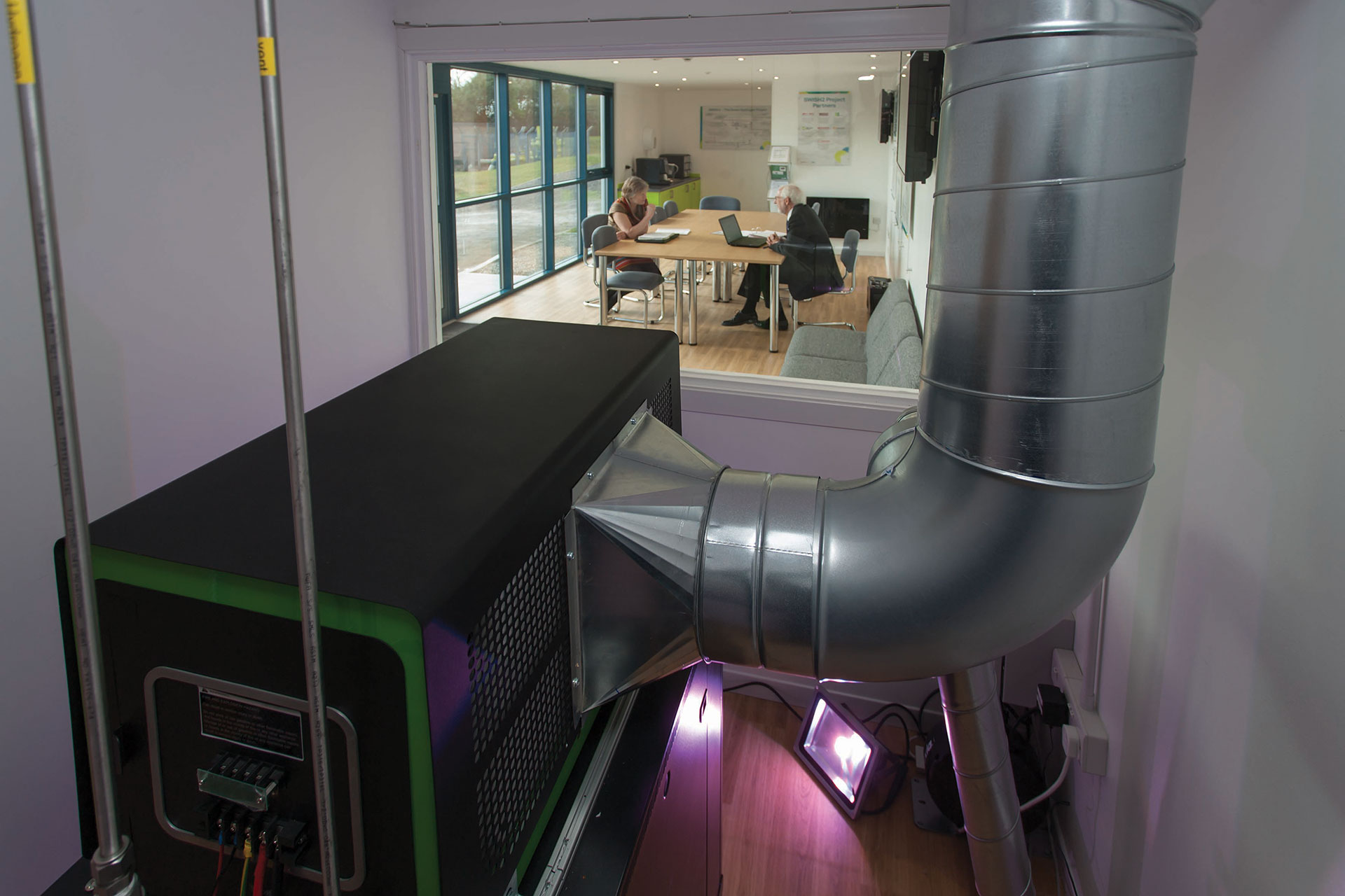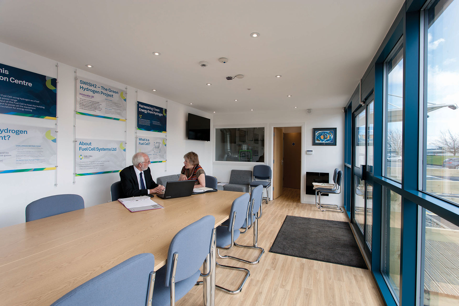 The open-plan building, fitted with a disabled toilet and uprated glazing to help reflect solar radiation, was delivered right on schedule. Fuel Cell Systems then fitted it out for use as a hydrogen-powered education centre. They added a plant room to house the fuel cell, a small office and kitchenette and created a large central meeting room and exhibition area. The building’s energy efficiency was enhanced by installing extra wall and ceiling insulation and LED bulbs with PIR sensors to minimise energy use. It requires only a 3kW fuel cell to power it.