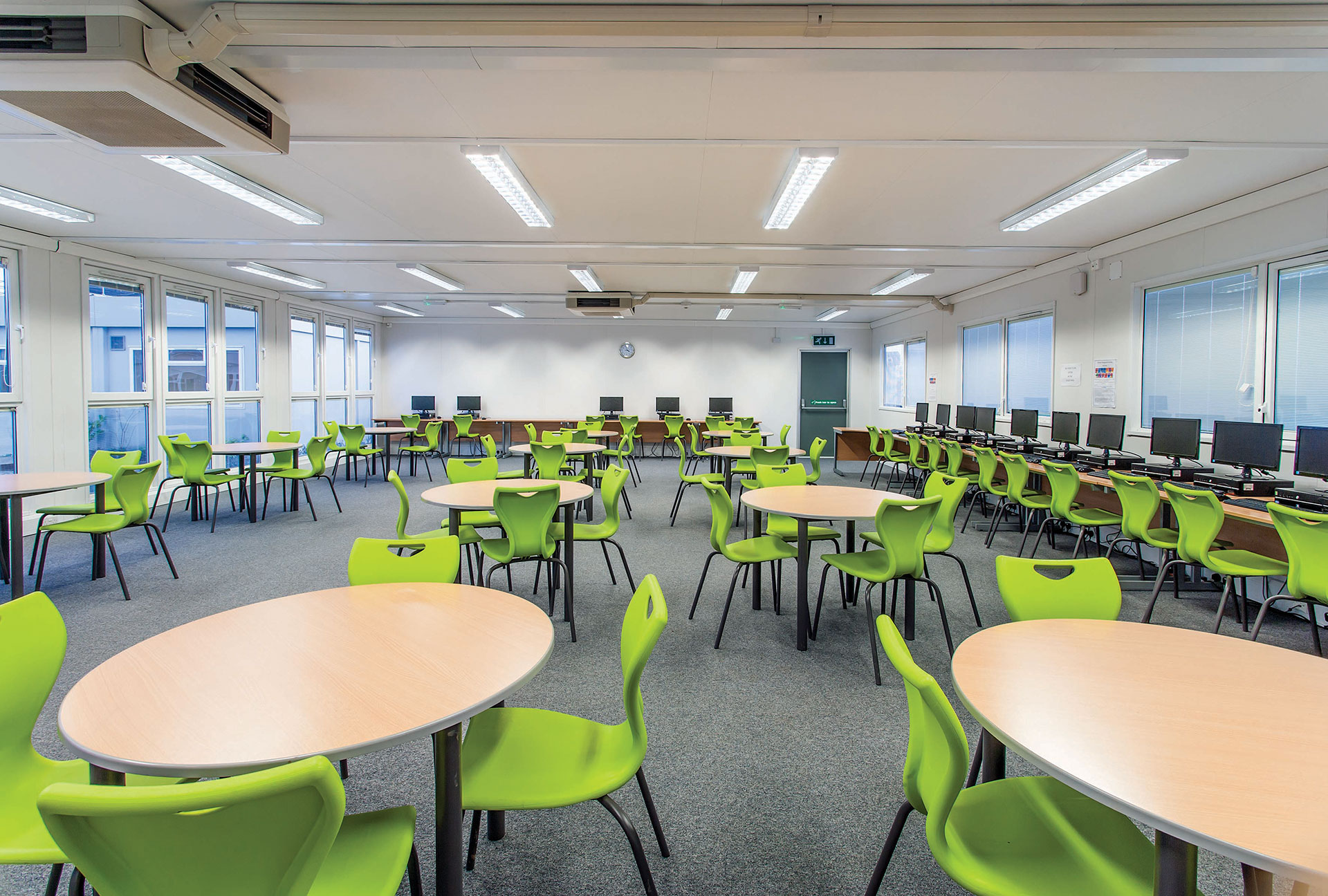 Portakabin created a spacious, open-plan sixth form study centre using its Ultima Vision building system, with a full-height glazed wall across the front elevation. Two large double classroom buildings were provided, housing two multi-purpose classrooms, an art room fitted with extra sinks and vinyl flooring, and a cyber café for the students.