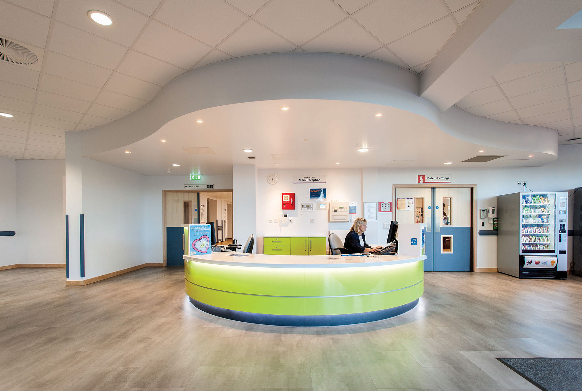 The units were installed partially completed with window frames, first-fix electrics, HVAC ducting, plumbing and a high-performance concrete floor. The off-site approach minimised disruption to patient care, while ensuring the new facilities were operational prior to seasonal winter pressures. The new building accommodates a consultant-led delivery unit, two obstetrics theatres, a neonatal unit, triage centre, women’s outpatient department and a midwife-led birthing unit with four birthing pool rooms, as well as a rooftop plant room. The external appearance of the building is designed to complement adjacent facilities, featuring rendered façades, ribbon glazing around the first floor and a large atrium entrance spanning two storeys. There is full-height glazing to the stair towers on both wings and large projecting window bays. The project achieved a BREEAM ‘excellent’ rating. Its sustainable features include a biodiverse green roof with a variety of meadow flowers, photovoltaic panels above the plant room and an energy-efficient combined heat and power (CHP) system.