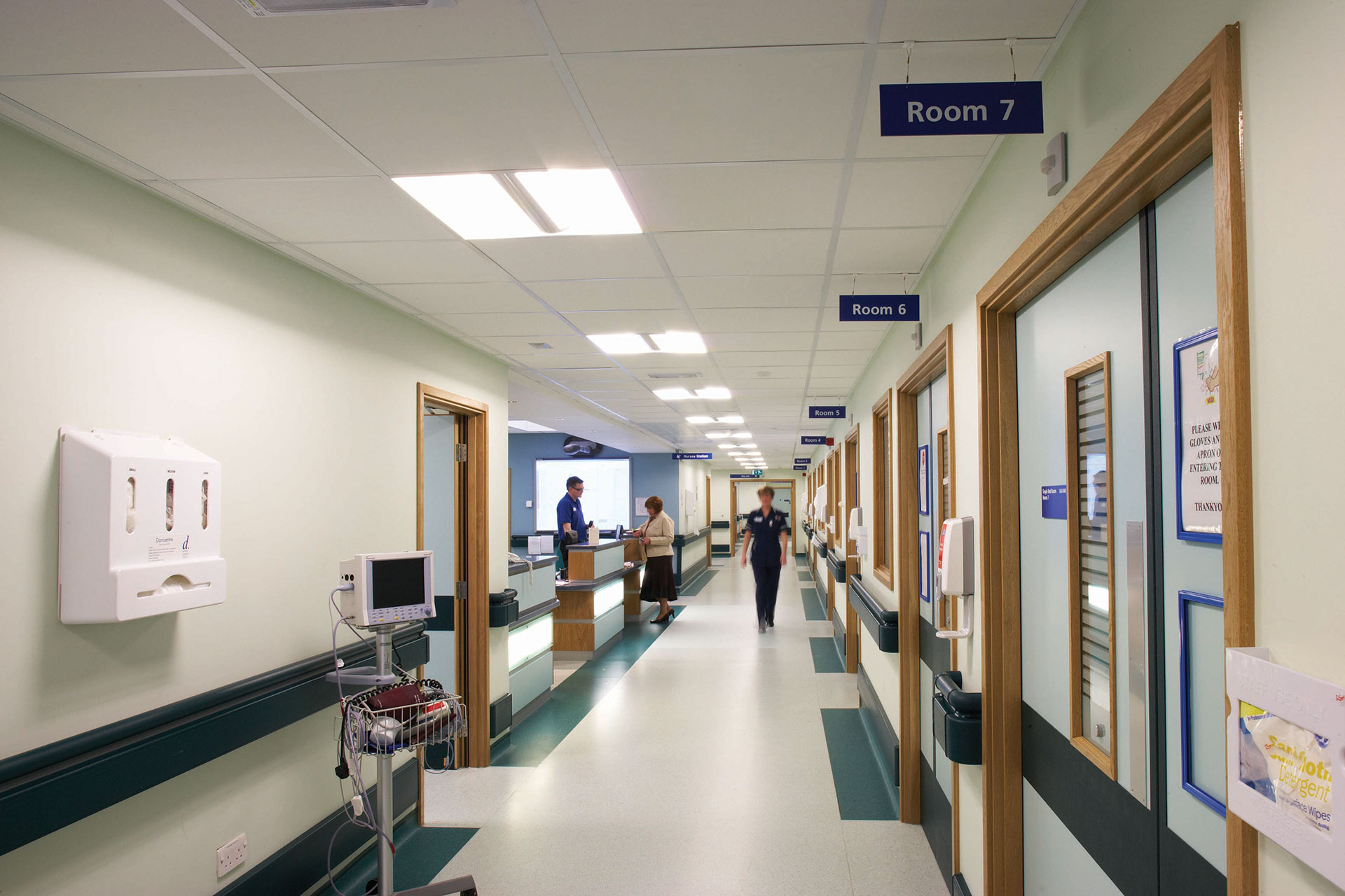 The 1,710m2 single-storey extension to the existing department was delivered in just over six months and provides a range of facilities for acute emergency care, including four-bed and single en-suite bedrooms, an isolation ward, high-dependency beds, consulting rooms, waiting areas, changing facilities and offices.