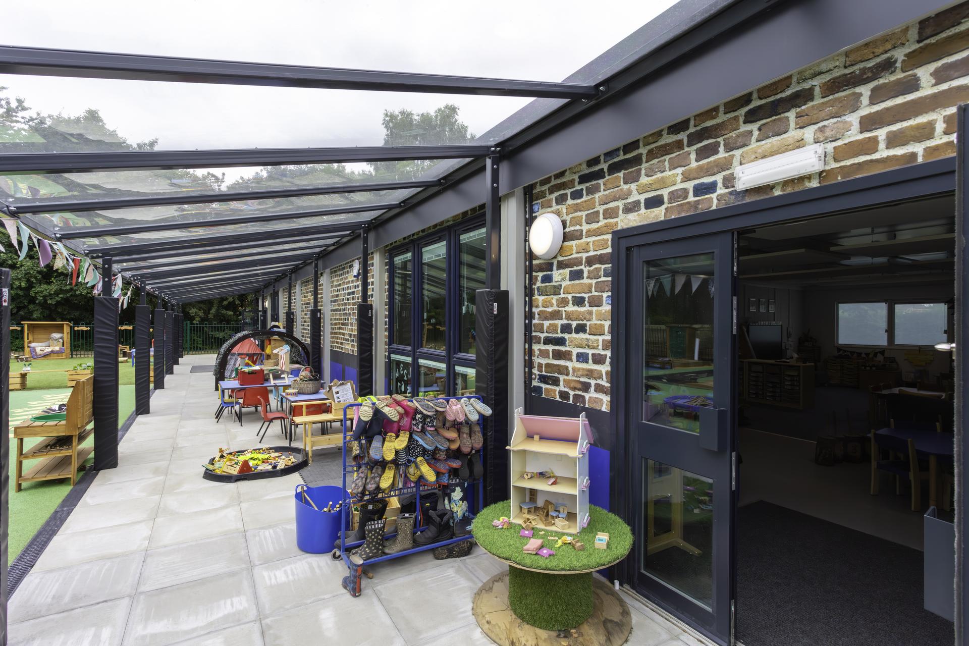With outdoor learning and play a high priority, working with the Portakabin groundworks team, an outdoor play area with bespoke canopy and Soakaway was created for year-round use.