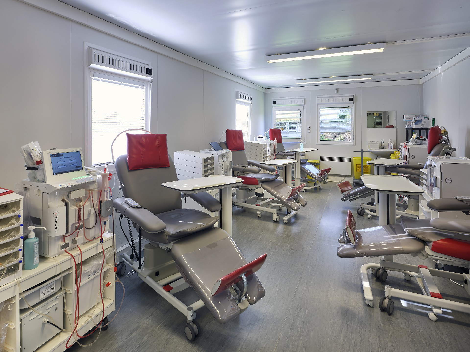 Das Fedasil-Zentrum in Jumet nimmt Asylsuchende mit unterschiedlichem Hintergrund auf. Unter ihnen sind einige Dialysepatienten, die nicht unbedingt die Möglichkeit haben, regelmäßig nach Brüssel zu reisen, um ihre Behandlung durchzuführen. Der Leiter der Dialyseabteilung des Marie Curie Bürgerkrankenhauses hielt es daher für angebracht, auf dem Gelände von Fedasil selbst einen Raum einzurichten, in dem sie Selbstdialysen durchführen können. "Die Idee war, eine Patientengruppe in unsere Krankenhäuser zurückzuführen, erklärte Herr Messina. Während der Gesundheitskrise hatte er bereits eine Preisanfrage für ein kleines Modul gestellt, das auf dem Gelände von Marie Curie aufgestellt werden sollte, doch das Projekt war damals nicht zustande gekommen. Er war jedoch mit der Reaktivität und dem Professionalismus von Portakabin sehr zufrieden gewesen und wandte sich daher auch bei diesem neuen Projekt an das gleiche Unternehmen.