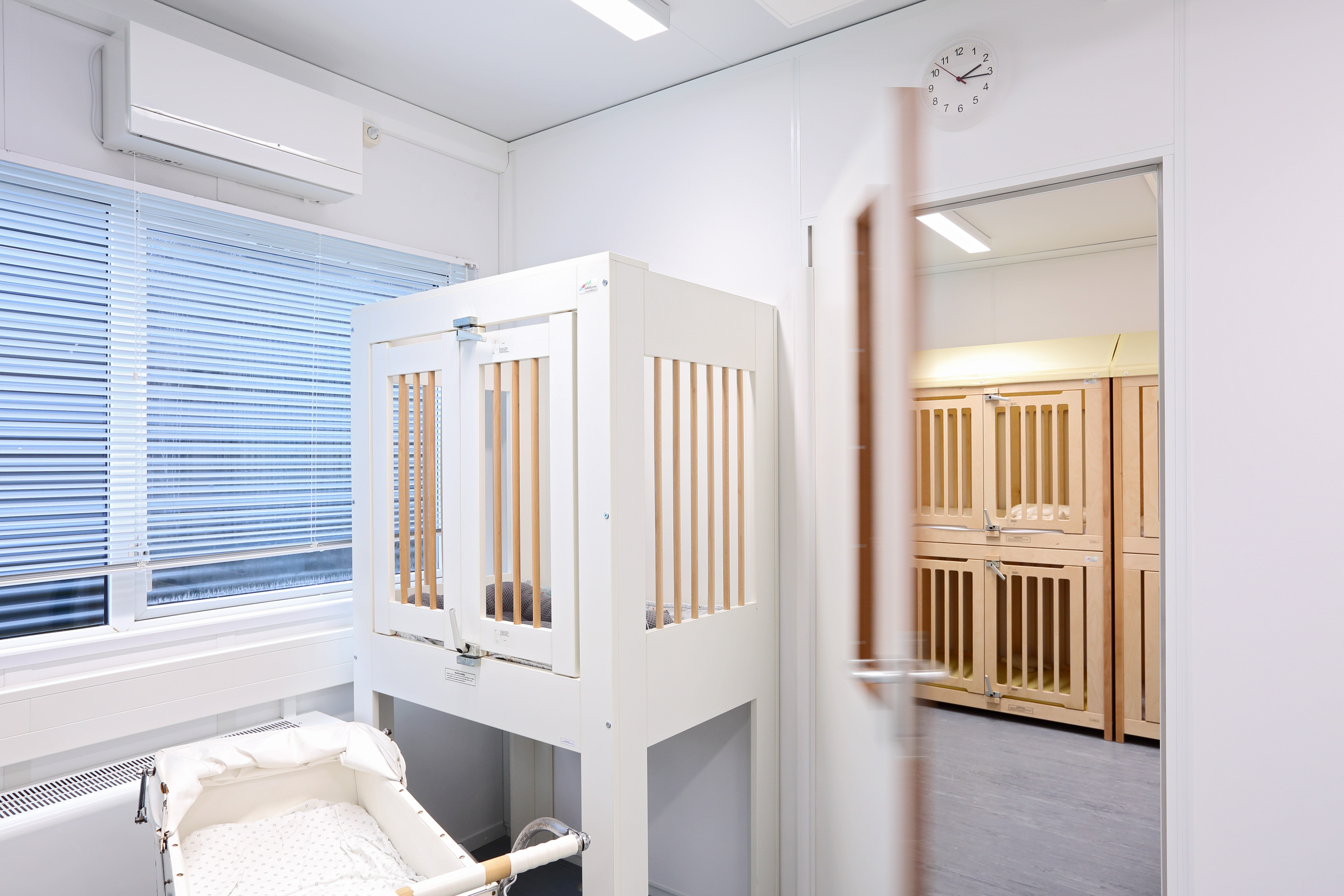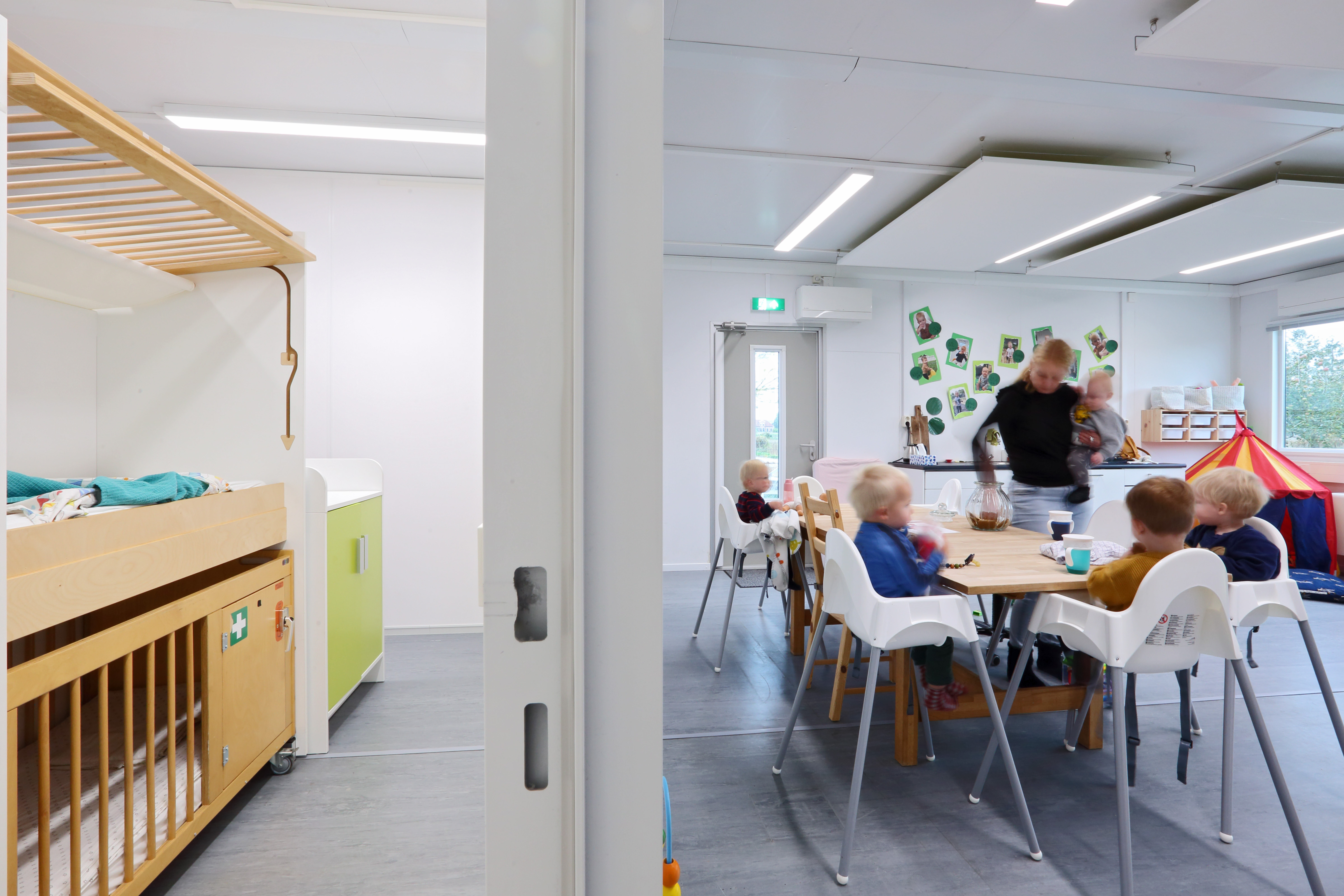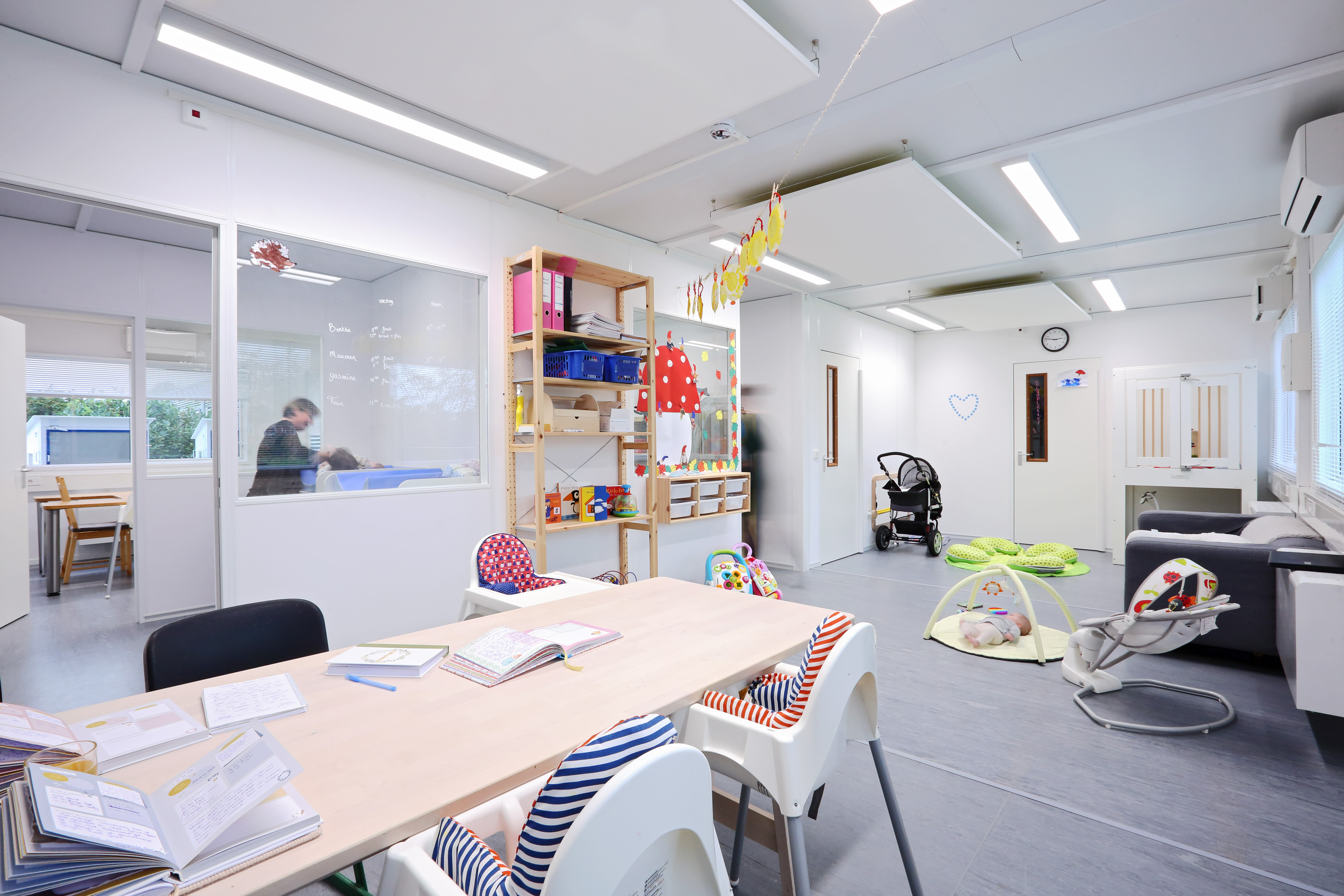 Kinderopvang Calimero had voor de jongste groepen extra ruimte nodig, met als resultaat een gecombineerde groep voor de baby’s en een groep voor de 1 á 2 jarigen. Alle groepen hebben beide aangrenzende slaapkamers en beschikken over het kind-veiligheidspakket. De babygroep is daarnaast ingericht met een keuken en verschoonruimte tussen twee ruimtes in, deze ruimtes worden gescheiden door middel van ramen voor het overzicht. De babygroep kan daardoor opgesplitst worden maar ook als één groep gebruikt worden. Het tijdelijke gebouw beschikt over een ruimte gang en sluis naar het bestaande gebouw. De kinderen kunnen fijn spelen in het nieuwe gebouw, er is veel ruimte en ook veel licht door de grote ramen in de units.