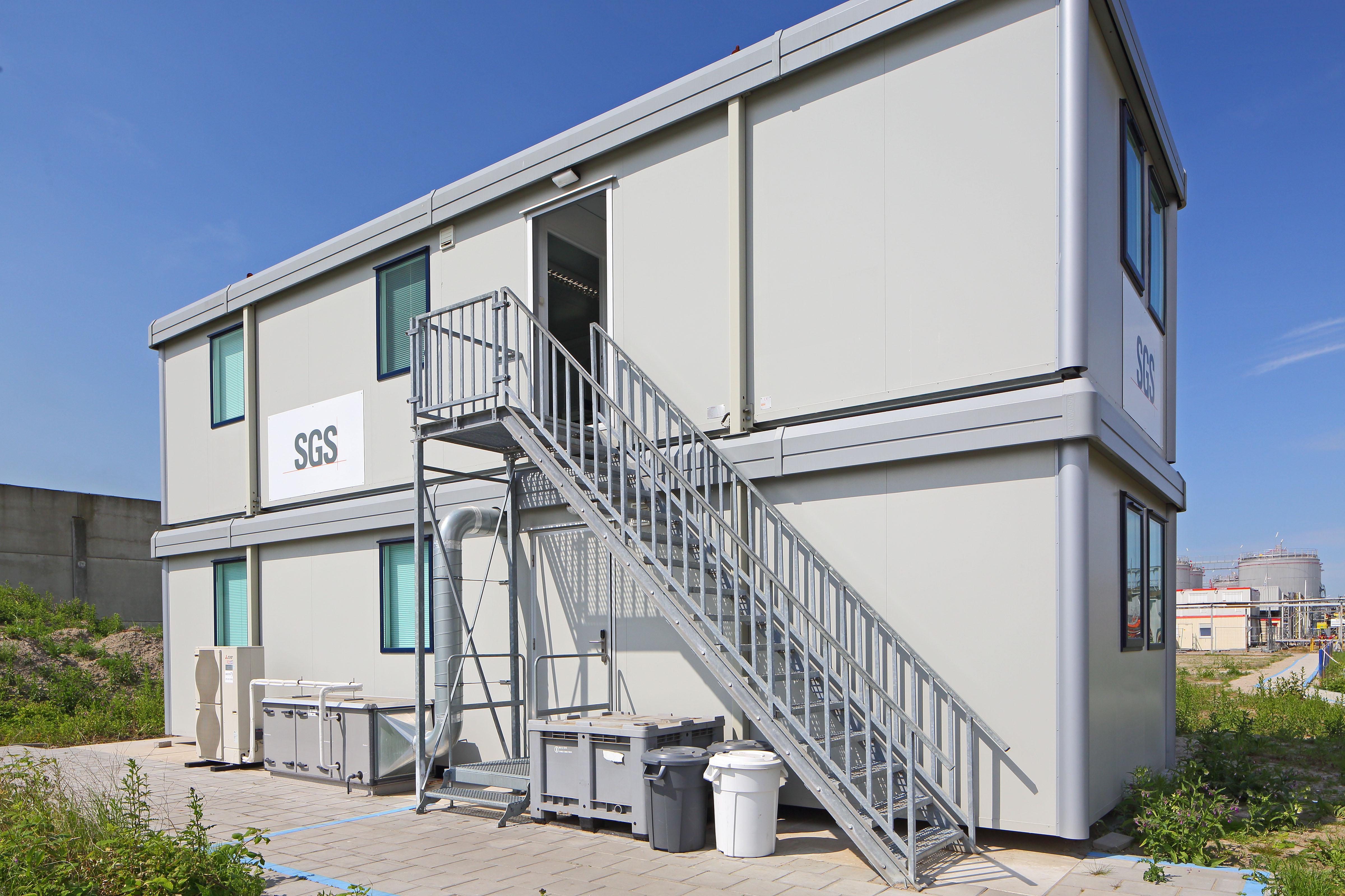 Een twee-laags gebouw bestaande uit twee Titan units bleek de juiste oplossing voor SGS te zijn. Op de begaande grond bevindt zich een volledig ingericht laboratorium om eerstelijns testen uit te voeren op locatie voor de klanten van LBC terminal, daarnaast is er een opslagruimte. Een gedeelte van de unit heeft een verstevigde vloer om de chemicaliënkast veilig te installeren. Op de eerste etage is een kantoor en kantineruimte ingericht waar 24/7 gebruik van wordt gemaakt door de ploegen van SGS. De ruimtes werden binnen een week volledig ingericht en worden ervaren als een prettigere werkomgeving dan het oude traditionele kantoor!